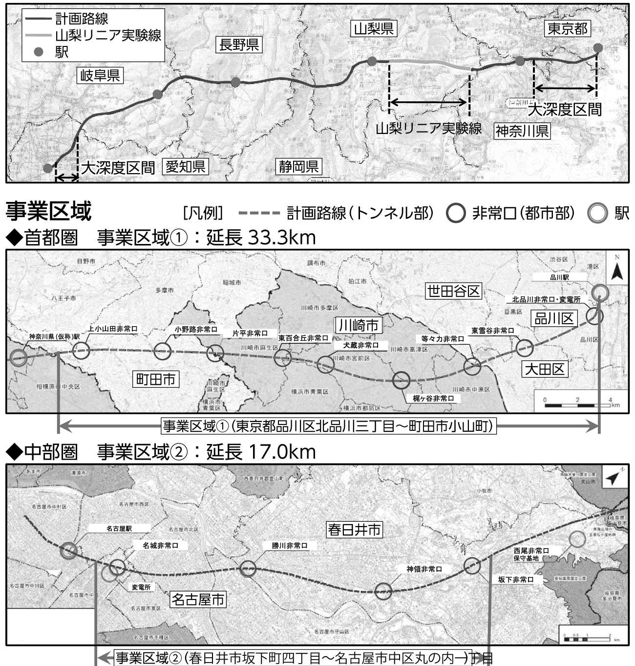 ▲リニア計画路線図と首都圏・中部圏の大深度ルート概略。