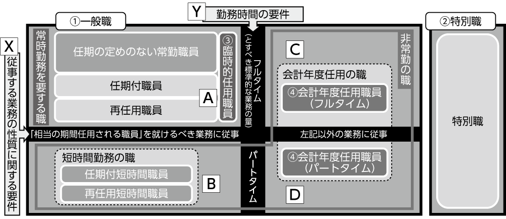 まず職員が担当する「仕事」の特徴を、X軸として「業務の性質に関する要件」で「相当の期間任用される職員を就けるべき業務」と「それ以外の業務」に分類し、Y軸に「勤務時間の要件」から「フルタイム勤務とすべき標準的な業務の量がある職」かどうかで二つに分類し、全部で四つの領域に分類しています。ここに本格的な業務でフルタイム勤務(A領域)、本格的業務だがパートタイム勤務(B領域)、本格的でない業務のフルタイム勤務(C領域)、本格的でない業務のパートタイム勤務(D領域)という形で分類されることになります。