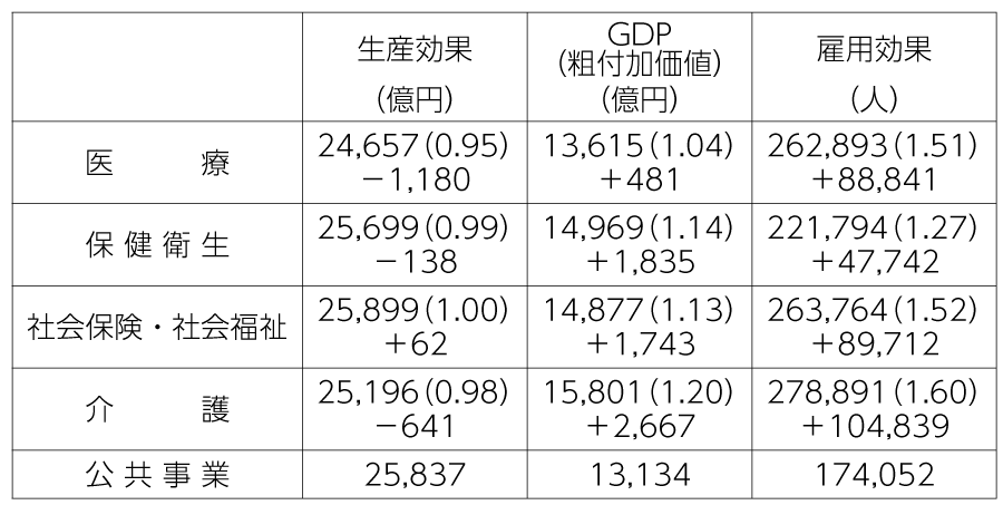 公共事業との比較でみた場合、生産は0・9~1・0とほぼ同じですが、GDP効果は1・0~1・3倍と医療等の経済波及効果が大きく、雇用効果では1・2~2・0倍とさらに大きくなります。