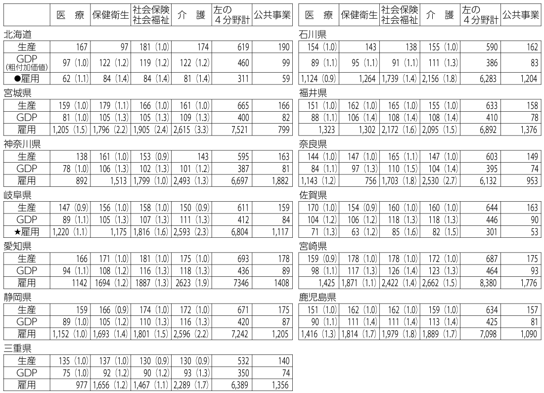 まずGDP効果では、医療分野では、すべての県が1倍以上で、多くの県は1・1倍。保険衛生では、1・1~1・4倍で、1・4倍が2県(福井県、鹿児島県)。社会保険・社会福祉では、1・1~1・5倍で、1・3倍が6県。介護では、1・2~1・4倍で、福井県、奈良県、鹿児島県は1・4倍。