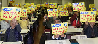3月19日、「明るい会」と「よくする会」が呼びかけた、「大阪市なくなる!くらしこわれる!『都構想』ストップ!維新政治ノー大阪府民集会」には、会場定員800人を超える市民が集まり、『都構想』反対の熱気あふれる集会となりました。この集会では、冨田宏治さん(関西学院大学法学部教授)が講演し、都構想住民投票について、橋下・維新のポピュリズムが、非常に危険な方向に市民をリードしていることを強調しました。また、各界から、住之江区医師会会長の松島三夫さん、元大阪府小学校校長会の西林幸三郎さん、「あかん」カジノ女性アピール呼びかけ人の佐々木唯さん、喜入肇さん(東京自治体労働組合総連合書記長)、北山良三さん(日本共産党大阪市会議員団団長)、旭堂小南陵さん(府民のちから2015)らの発言がありました。