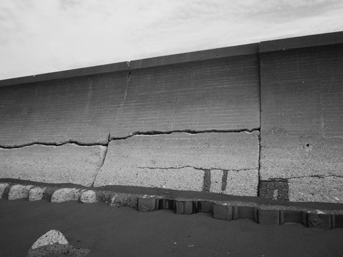 とくに、新ひだか町静内駒場では、防波堤に大きな亀裂が入るなどして非常に危険な状態にあり(写真)、そのすぐ脇に事業所がある静内地方自動車整備協同組合の理事長は、「あと一度強烈な高波が来たら、護岸もバラバラに壊れてまた大きな被害を受けるかもしれず、大変恐ろしい」と述べています。