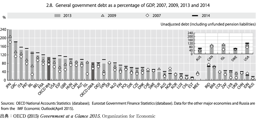 これらのことと、あわせて確認しておきたいのが、図2になります。図2は、OECD各国のGDP対する負債の水準を示したものになります。周知の通り、日本はGDPに対して負債の水準は突出しています。