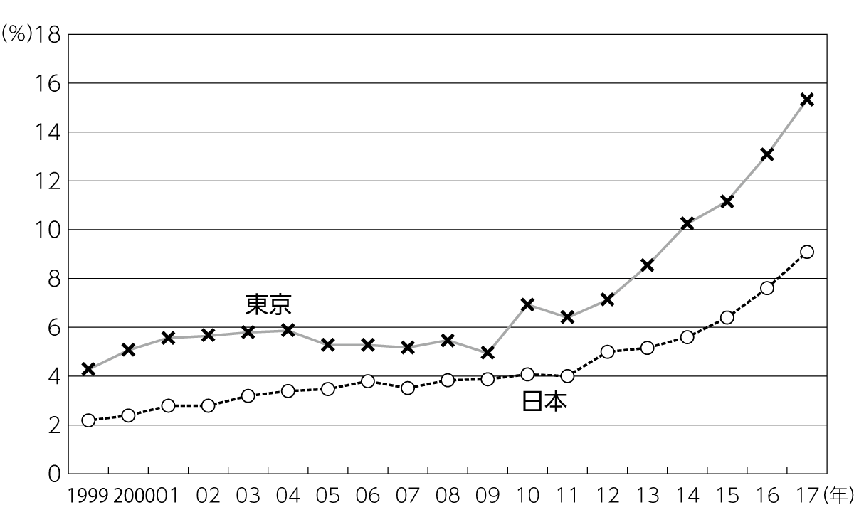 しかし、2012年以降結核患者に占める外国人の割合が一転し急増しています。全国でみても2011年の4・1%から2017年の9・1%に急増。東京都では2011年の6・4%から2017年の15・4%とさらに著しい(図2)。こうした増加の背景にあるのが、東南アジア・南アジアの新興国出身の技能実習生や日本語学校生の増加です。技能実習生も2010年の法改正で労働者としての権利が擁護されることが明確となりましたが実際には労働法違反の解雇がしばしば起きており、2017年にはこれを防止すべく注意を喚起する告示が法務省・厚労省から出される状況でした。わたしたちのところにも結核発病によって実習を中断して帰国させられた技能実習生の報告が少なからず寄せられています。技能実習生の多くは借金を抱えて実習に来ています。結核を理由に解雇される事例があれば、そのことを知った技能実習生のなかには、借金を残したまま失職することをおそれて結核の初期症状があっても受診をせずに隠す人や帰国を受け入れられず失踪する人も出てくるでしょう。日本語学校生についても立場はアルバイトであるため、病気をした際に療養の支援は受けられず簡単に生活が困窮することになります。そして授業料が払えなければ、在留資格を失い帰国を余儀なくされます。このように、結核を発病した際にしっかりとした療養支援が受けられない労働者を増やしてしまったことが、結核対策上に負荷を与えています。2012年以降、外国生まれの結核患者のうち診断後途中で帰国をする人の割合が急速に増えています。