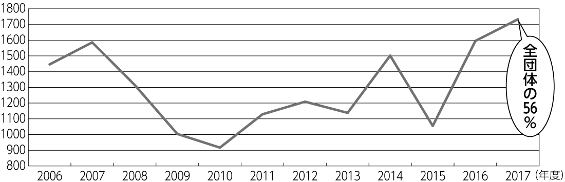 図2は実質単年度収支が赤字である団体数の推移をみたものですが、「自治体財政健全化法」が本格実施された2008年度から2010年度にかけて赤字団体数が減少しています。しかし、地方一般財源抑制策の継続の影響がじわじわと自治体財政の収支悪化をもたらし、2011年度以降、赤字団体数は増加傾向にあります。
