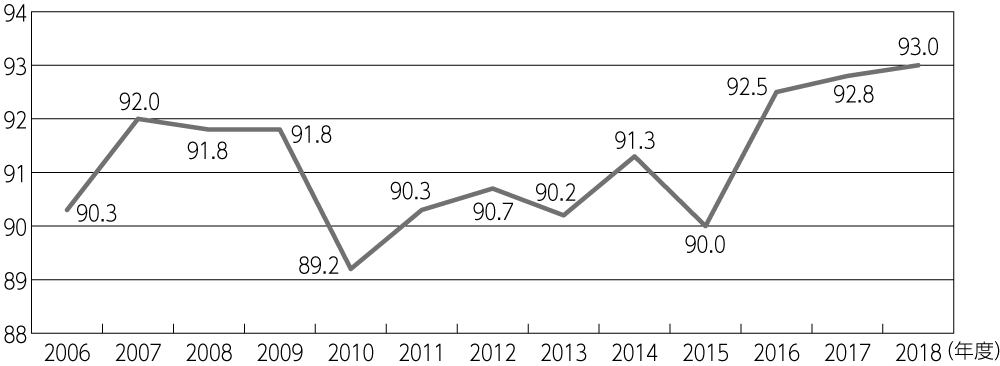 また、市町村の経常収支比率(加重平均)をみると、2010年度の89・2から上昇傾向が続いており、2018年度は93・0と財政の余裕度が低下しています(図3)。