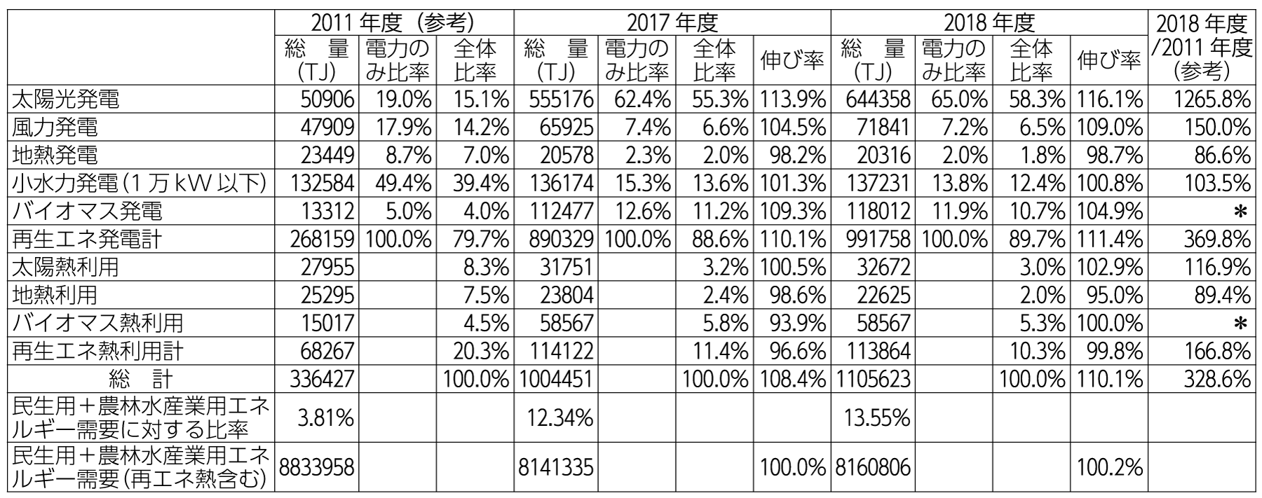 固定価格買取制度の対象となっていない再エネ熱は、対前年度比99・8%とほぼ横ばい状態です。日本の再エネ供給量に占める再エネ熱の割合は、20・3%(2011年度)から、10・3%(2018年度)へと低下しています。