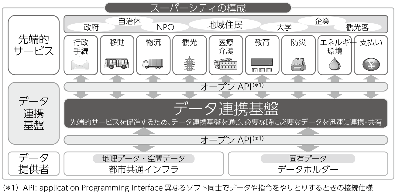 *API:Application Programming Interfaceの略。基礎作業と応用作業とを連携させる役目をするもの。「データ連携基盤整備」の事業者と、データを用いて「先端的サービスを行う」事業者を連携させる役割。「スーパーシティ」は両者を連携させるAPIの役割を担わされるが、基本設計は国が行う。