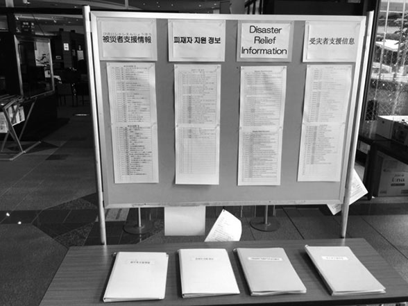 こうした事例は、避難所のルールをあらかじめ翻訳して掲示する、定期的に通訳が巡回してコミュニケーションを支援する、といったことで未然に防ぐこともできます。普段から顔の見える関係を築いていくことで解決できることでもあります(写真1)。近年の災害では、自治体などがいち早くホームページに多言語化した情報を掲載したり、SNSを通じて直接外国人に発信したりするようになりました。しかし、情報の多言語化は「手段」であって「目的」ではありません。避難生活を送る周囲の日本人とのコミュニケーションも意識し、被災地全体の安心感の醸成をめざした双方向性の高い支援や、普段からの多文化共生の地域づくりを進めていく必要があります。