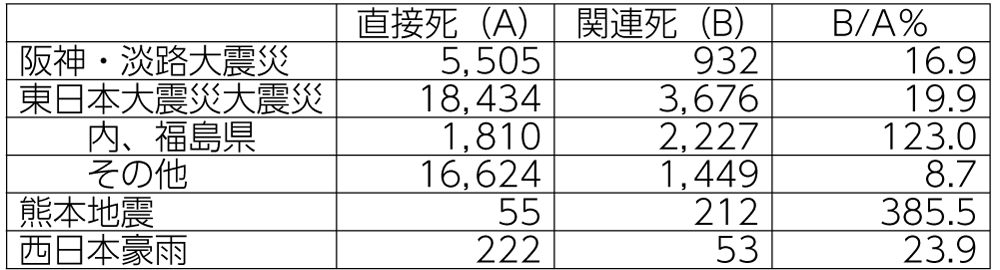 復興災害の原因は災害後の対応のまずさにありますが、それを端的に示すのが災害関連死であり、近年の災害では直接死に対する関連死の比率の相対的な増加が指摘されます。
