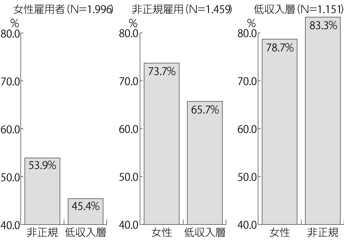 以上のような女性の貧困の要因は、図1を見れば明らかです。女性雇用者のうち非正規労働者は53・9%を占め、非正規労働者のなかでは女性は73・7%を、また低収入層では78・7%に達しています。つまり、女性雇用者≒非正規雇用≒低収入層は重なっており、固まりとなっているのです。