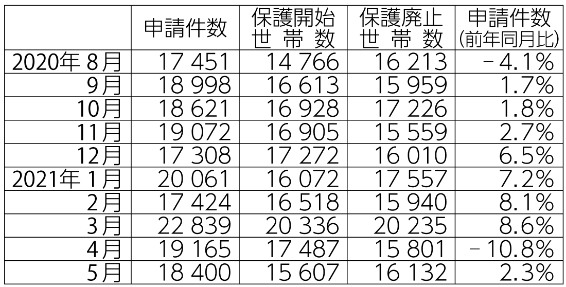 貧困が拡大しているにもかかわらず、2020年9月から2021年3月まで7カ月連続で保護申請数は前年同月比で増加しているものの(表2)、生活保護利用者は逆に2020年2月の206・4万人から2021年4月の204・3万人へと減少しています(図2)。リーマンショック時は、2008年暮れの年越し派遣村に訪れた500人中300人が生活保護となり、全国的にも2008年平均159・2万人が2009年平均176・4万人へと1年間で17万人、10・9%増加したのとは全く様相が異なっています。