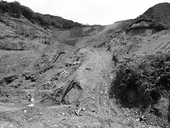 - (3)土砂条例がなかったために、写真2に示すように無秩序に堆積されたものが多く、豪雨で土砂崩れしやすく、現に①と②の2カ所で土砂崩れしています。