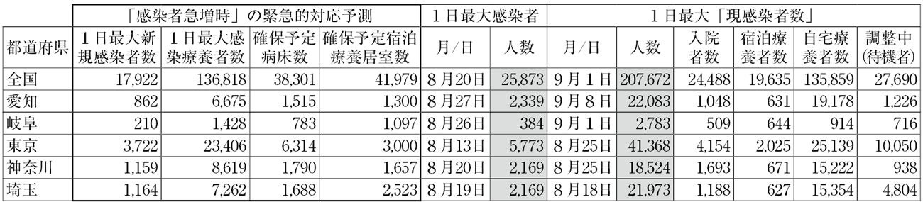 厚生労働省は、3月までの「第3波」の感染拡大状況を受けて、新たな「病床・宿泊療養施設確保計画」の策定を都道府県に求め、6月までに計画を策定しました。計画では、「1日最大感染療養者予測」(急増時)の全国合計は13万6818人で、それに伴い「確保予定病床数」3万8301床、「確保予定宿泊療養居室数」4万1979室を準備し、差し引き「自宅療養者」は5万6000人余りの予測となっていました。7月から感染者が急拡大する「第5波」では、「現感染者数」が感染急増時「予測」を突破し、最高時20万7672人と、予測を7万人も超過しました。全国集計では、「入院者数」の最高は9月1日2万4488人、「宿泊療養者数」の最高は8月25日1万9937人で、いずれも「確保予定数」内に収まっています。しかし、それは、「自宅療養者数」が最高5万6000人予測を大幅に超過し、9月1日13万5859人と、2・4倍にも達していたことによります。結局、「1日最大感染療養者予測」を26都府県で超過する感染爆発が全国で起きてしまいました(表2)。