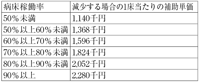 「新型コロナウイルス感染症」の感染拡大が猛威を振るう中、その一方では、「地域医療構想」による病床削減を中心とした地域における病床運営の見直しが進んでいます。国は2019年9月末に424の公立・公的病院を名指ししたリストを公表し、再編見直しを求めました。そして、それを後押しするとして「重点支援区域」を指定し、これまでに11道県14区域44病院が対象とされ、着々と病床削減、病院再編合理化計画が具体化されています。これまでに具体化された計画だけでも7区域17病院で現行3242床が、12病院2392床へと5病院、850床も削減するという計画となっています。これらの計画が、2020年度の「新型コロナウイルス感染症」対応で全国の医療機関が危機的状況にあった最中に着々と進められていることが重大問題です。「地域医療介護総合確保基金」では、当初から病床削減・機能転換・再編等への設備補助等に優先配分され、2020年度は基金の医療分1194億円の内、約半分の560億円を「地域医療構想の達成に向けた事業」(病床削減・機能転換・再編等)に優先配分するとともに、「重点支援区域」には新たな「ダウンサイジング支援」として84億円を予算措置し、基金の補助基準の1・5倍の補助金支給や計画を進める上でのさまざまな名目補助が具体化されています。そして2021年度予算では、「病床削減法」として194億円の予算が組まれ、病床の「ダウンサイジング支援」は恒久的に保障されることとなりました。補助金は病床削減が大きな目的であり、削減1床当たりの補助単価も、病床稼働率が50%未満でも114万円、最大90%以上稼働率でも228万円の補助金となっています(表3)。そもそも、稼働率90%以上での削減補助金が50%未満の2倍もあり、削減を補助するということ自体理解できません。病院経営に四苦八苦し赤字経営脱却を図ろうとすると、病床削減で補助金をもらって減量経営していこうとする計画を後押しする仕掛けを組み込みました。これは、かつての稲作農業における「減反政策」と似通った、医療分野における「減床政策」といえます。