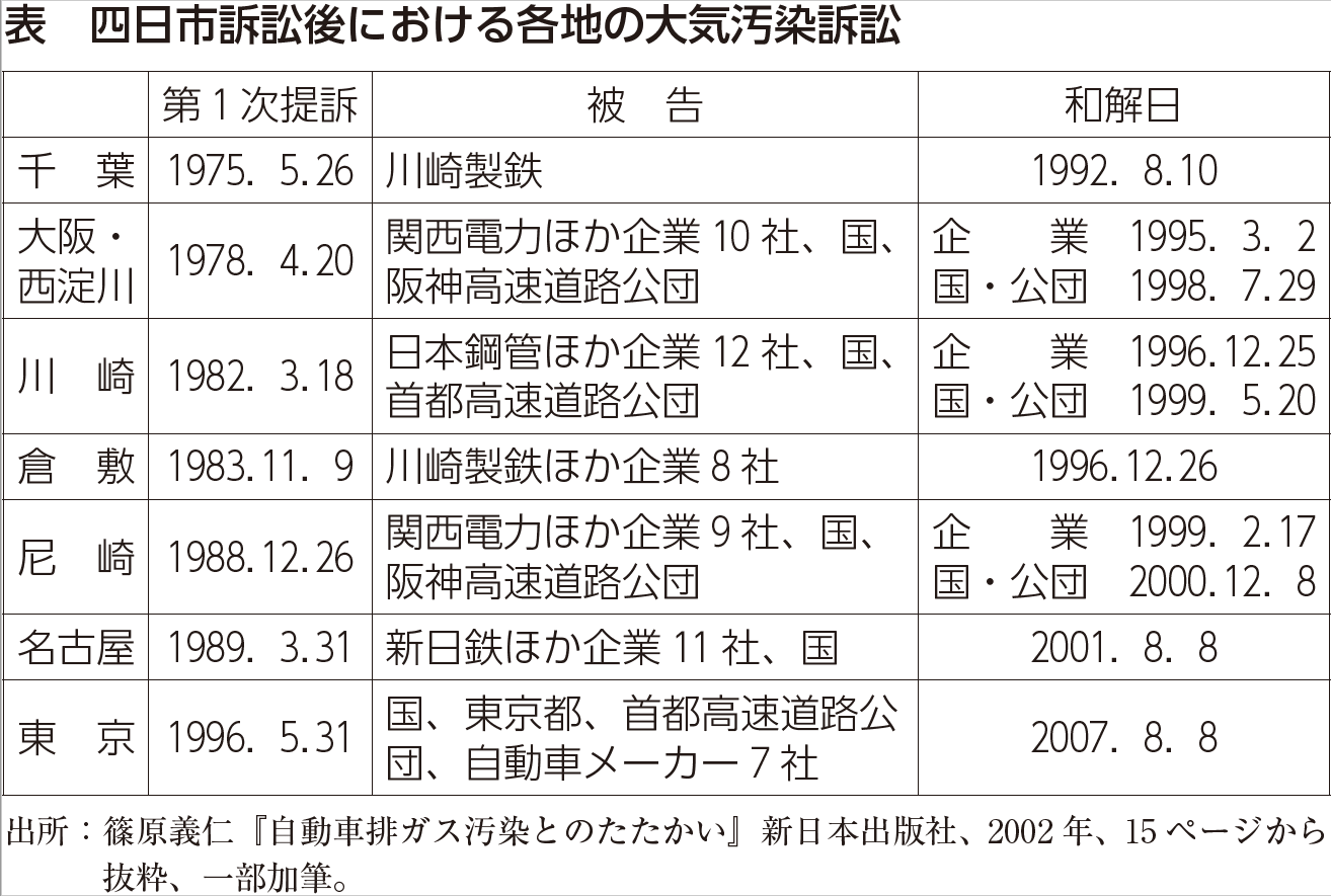 「困難な過去」は今も地域に影を落としています。四日市公害訴訟の判決が出された後、他の地域でも大気汚染公害の被害者が集団訴訟を提起しました(表参照)。