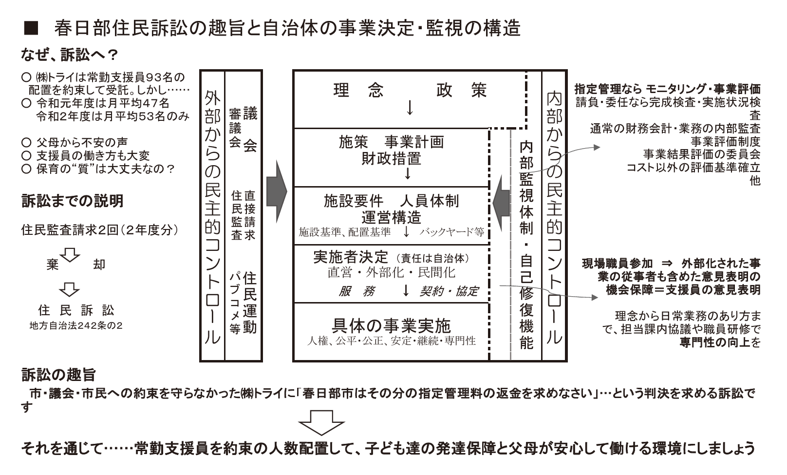 埼玉県春日部市では放課後児童クラブ事業(以下、学童事業)の指定管理を受けた㈱トライグループ(以下、トライ)が、市との協定を守らず常勤支援員の配置を怠っていることは、子ども達から発達の機会を奪い、事業の質を後退させ、支援員には過重労働を強いるものだとして、市民が住民訴訟を起こしています。常勤支援員欠員分の指定管理料の「不当利得の返還もしくは損害賠償」を、春日部市からトライに請求させることを通じて、保育の質を守ることが訴訟の筋立てです。