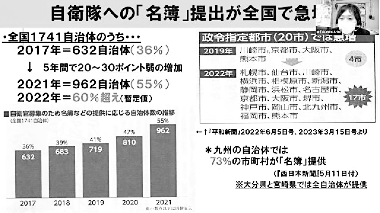 自衛隊はこれまでも、住民基本台帳を管理する市区町村から、募集対象者の個人情報を「閲覧」等によって入手してきました。これを紙や電子媒体、宛名シール等で提供させる動きが急速に強まっています。提供する自治体は全国1741のうち2017年は36%程度でしたが、2021年には半数を超え、2022年は6割を超えました。特に政令指定都市(20市)は著しく、『平和新聞』の調べでは2019年は4市だったのが2022年には17市に急増しました。