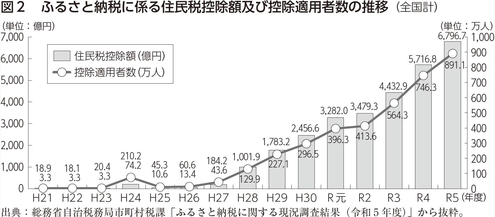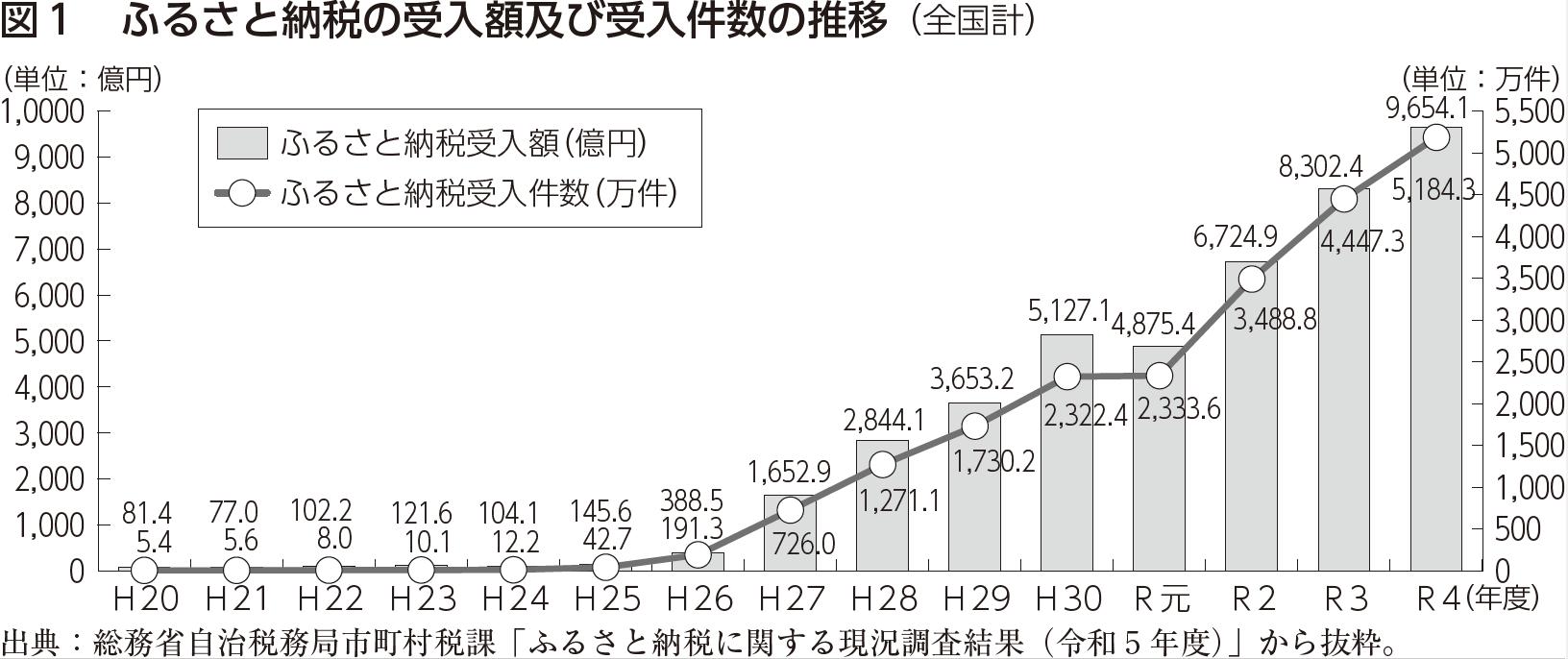 本年8月、総務省から令和5年度のふるさと納税に関する現況調査結果が公表されました。ふるさと納税の受入額及び受入件数の全国計は年々伸びており、令和4年度の実績は約9654億円と、1兆円に迫る勢いで増加が続いています(図1)。また、制度利用者の増加等に伴い、住民税控除額及び控除適用者数も年々増加が続いています(図2)。