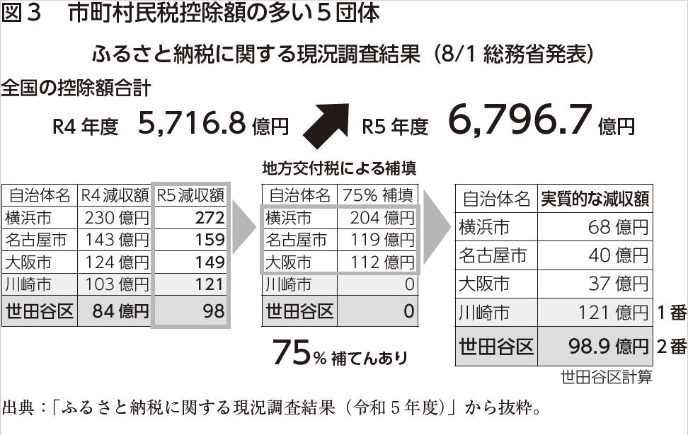 市町村民税控除額の多い5団体は図3の通りですが、上位3自治体は地方交付税の交付団体であり、税控除額の75%は地方交付税で補填される仕組みとなっています。ですから、地方交付税の不交付団体である第4位の川崎市と第5位の世田谷区には国からの補填がなく、100%の影響を受けているため、実質的な減収額は川崎市に次いで、世田谷区が2番目となっています。