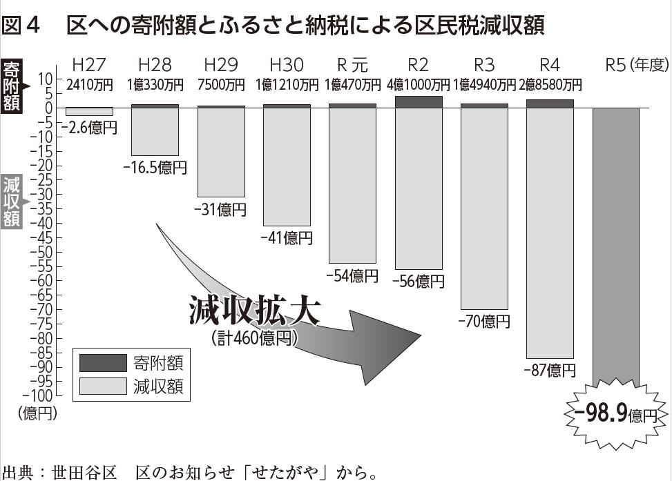 図2のとおり、制度開始当初は利用が低調でしたが、平成27年度に個人住民税所得割額の控除上限が1割から2割へ拡大されたことや、が創設されたことで、自治体間のいわゆる返礼品競争が過熱化し、全国の寄附金額が急増しました。それに伴い、減収額も増加し、特に都市部の減収額が大きくなっています。その後、総務省において令和元年度には指定制度を創設し返礼品の地場産品基準を設ける等の制度改正を行いましたが、依然として都市部の減収は増え続け、東京23区の合計では、令和5年度は約830億円となり、平成28年度からの累計額では実に3600億円を超える額となっています。その中でも、世田谷区の令和5年度の減収額は約98・9億円と、東京23区では一番多く、全国で見ても実質的な減収額が第2位であり、制度利用が増えるにつれ、減収額は年々増加し続け、平成27年度から令和5年度までの累計では、実に約460億円にも上っています(図4)。このまま減収額が増加し続ければ、区民サービスの低下を引き起こしかねない大変大きな問題となっています。