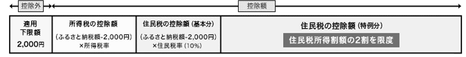 「ふるさと納税制度」に係る控除額の仕組みは以下のとおりです。個人が都道府県・市区町村に対して「寄附」を行うと、寄付額のうち2000円を超える部分について、一定の上限まで原則として所得税・個人住民税から全額控除するというものです(なお、東京都は「ふるさと納税制度」に参加していません)。具体的な控除のイメージは図1のとおりであり、要は住民税所得割額の2割を上限として、[寄付額-2000円]の全額が税額控除されることになります。住民税所得割額が多額となる高額納税者ほど限度額も高くなります。たとえば住民税所得割額が50万円であれば、その2割である10万円が限度額となり、10万円をある自治体に寄附し、その自治体からの返礼品の価値が3万円であった場合、2万8000円(3万円-2000円)分の価値を得ることになります。また、住民税所得割額が200万円であれば、その2割である40万円が限度額となり、40万円をある自治体に寄附し、その自治体からの返礼品の価値が12万円であった場合、11万8000円(12万円-2000円)分の価値を得ることになります。別の見方をすれば、その分だけ実質的な節税を図れたことになります。