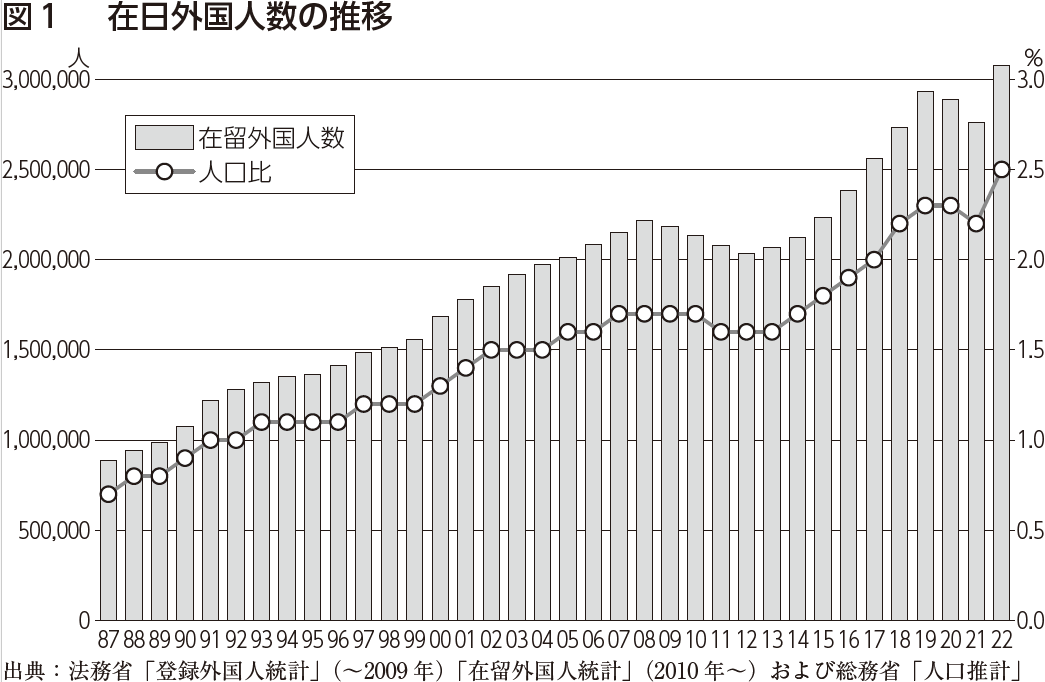 第一に、外国籍者の居住が多様な地域に広がるようになりました。2012年と比較すると、2022年の外国籍人口は1・5倍強に増加しましたが、その増加率は都道府県によって違いがあります。この間に増加率が2倍を超えているのは、沖縄、熊本、鹿児島、北海道、宮崎です。加えて香川、佐賀、埼玉、島根も1・8倍を超えています。人口に占める外国籍人口の割合は東京、愛知、群馬など関東、中部地方が高いですが、増加率で見れば、九州や北海道、四国などでの高さが目立ちます。この背景には、高齢化などで非都市圏を中心に労働力人口が減少し、その減少を埋める方策として移民労働者の受け入れが進められてきたことがあると考えられます。