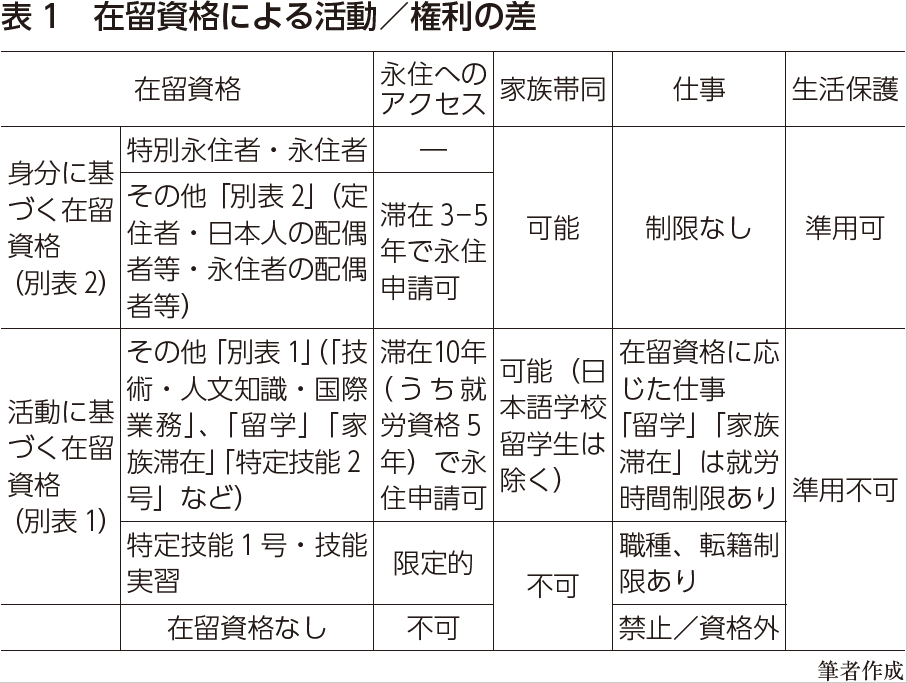 第二に、2010年代以降、より不安定な在留資格をもつ移民が多くなっています。日本に暮らす外国籍者には在留資格が付与されますが、この在留資格は移民の人たちの生活を規定する効果をもっています。在留資格は全部で29種類あり、大きく「活動にもとづく在留資格(別表1)」と「身分にもとづく在留資格(別表2)」の二つに区分されます。「別表1」は就労や留学といった日本で行う「活動」にもとづく資格であるのに対し、「別表2」は日本人との家族関係など「身分」にもとづく資格です。ここでは、権利の内実によって、「別表2」を永住がすでに認められている「永住者」「特別永住者」とそれ以外、「別表1」を家族帯同が認められない「技能実習」「特定技能1号」とそれ以外にそれぞれ分けてみましょう。あわせて、「在留資格なし」も加えて主な権利の差を示したのが表1です。そこからわかるように、「永住者」「特別永住者」→その他「別表2」→その他「別表1」→「技能実習」「特定技能1号」→「在留資格なし」の順に、権利は制限され、より不安定な地位となります。