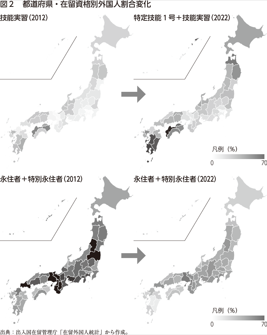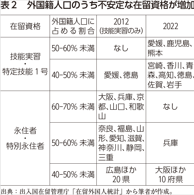 この特徴を第一の点とあわせると、非都市圏で主に増加しているのは「技能実習」「特定技能1号」の在留資格の者です。愛媛、鹿児島、熊本では「技能実習」「特定技能1号」の者がその県に暮らす外国籍者の5割を超え、4割を超える地域も九州、四国、東北など7県あります。これに対し、2012年の場合、「技能実習」の者が5割を占める都道府県はなく、4割を超えていたのも愛媛、徳島の2県だけでした。一方、「永住者」「特別永住者」の割合が5割を超えている都道府県は13、4割を超えている地域も20ありました(表2・図2参照)。この背景には、後述するように、2012年以降、拡大する移民労働者の受け入れの経路として、より不安定な資格が活用されてきたことがあります。