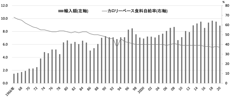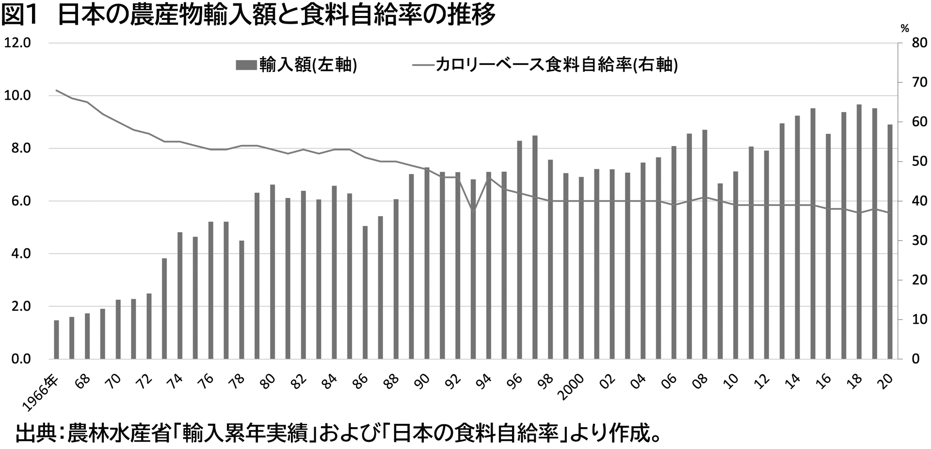 1961年に施行された旧農業基本法は、「緑の革命」と呼ばれる技術(改良品種、化学農薬・肥料、農業機械・施設、灌漑)を用いて農業の近代化を進め、土地生産性と労働生産性の向上を実現し、農地流動化による規模拡大と併せて、他産業並みの所得を得る経営を育てることを目指しました。また、同法の選択的拡大政策の下で麦、大豆、飼料等の輸入農産物に対する関税が引き下げられたため、輸入が増加し食料自給率が低下しました(図1)。