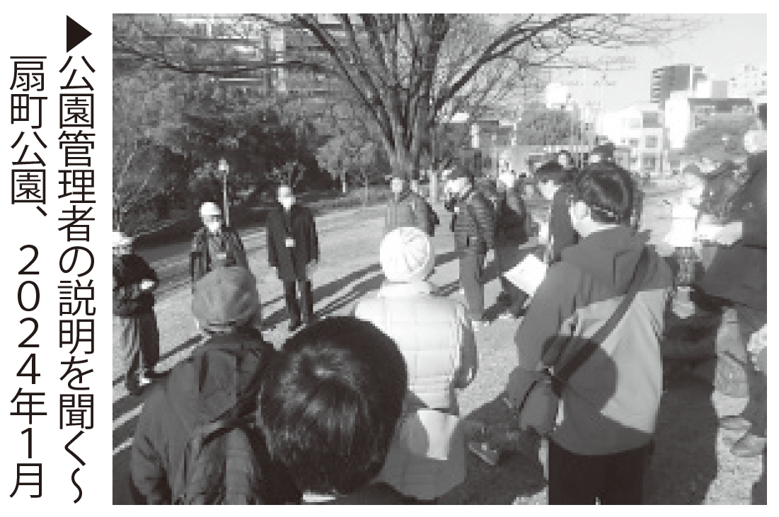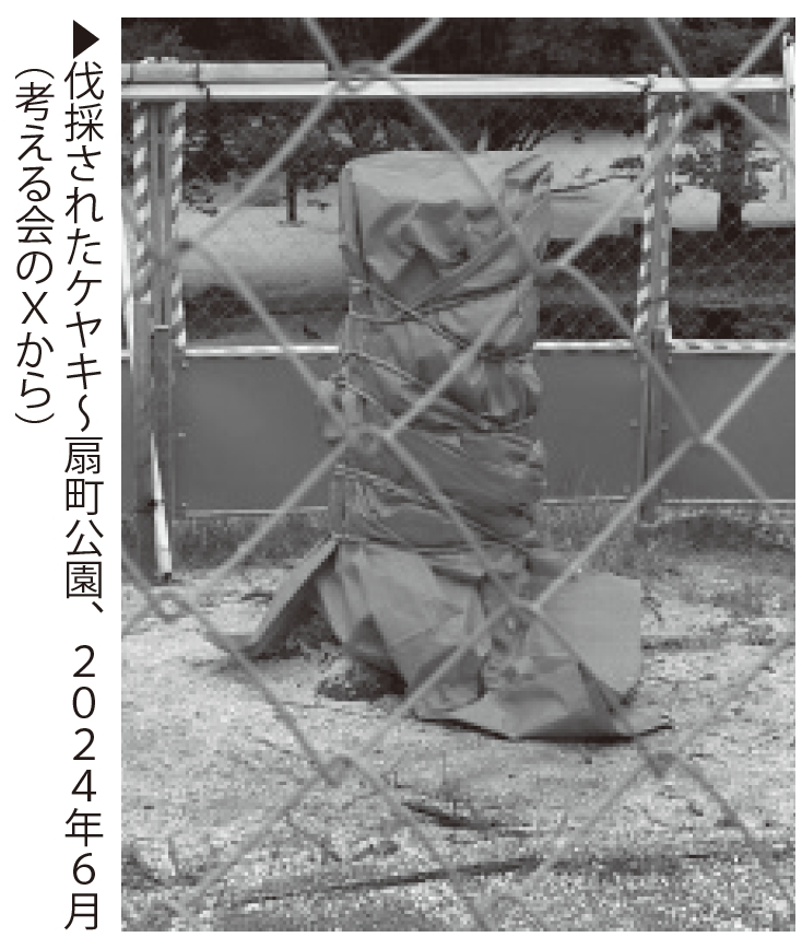 市はこのパークセンターのオープンに間に合わせるかのように、市民の抗議を無視して次々と伐採を進めました。考える会が今年5月に、独自に樹木医に依頼して「伐採措置は不要」、「保全を推奨する」という診断書を添えて保存を要望しましたが、「公園管理者の観点から総合的に判断して」伐採する、市民の要望は一切受け入れない、伐採日時は通知しないという、強硬なゼロ回答で、6月17日から伐採が始まりました。次々と伐採が続く中でシンボルツリーのケヤキだけは何とか守ろうと、メンバーが毎日ケヤキの〝木守り〟活動を続けていましたが、6月26日の夜に、見守る市民がいなくなるのを見計らって伐採されてしまいました。前代未聞の〝闇討ち〟ですが、見方を変えると強硬策しかないほど市民に追い詰められた状態であり、市民運動の力が大きくなっていると言えるのではないでしょうか。