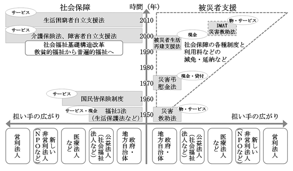それとは逆に同時期の社会保障は「社会福祉基礎構造改革」のただなかで、自らや家族の自助努力が失敗した場合にのみ福祉制度の対象となる救貧的なものから、介護保険のように誰もが利用する普遍的なものへと、そのあり方自体を大きく変えつつありました。1997年の介護保険法、2005年の障害者自立支援法などにより、行政が中心となってサービスを措置するのではなく、利用者が契約によってサービスを選択し、公費や保険で費用を賄うことを中心としたものへと姿を変えました。また、制度上の担い手はNPOなどの非営利法人や営利法人にまで広がりました。しかし、被災者支援の制度上の担い手は基本的に地方自治体のままでした。