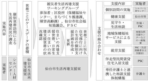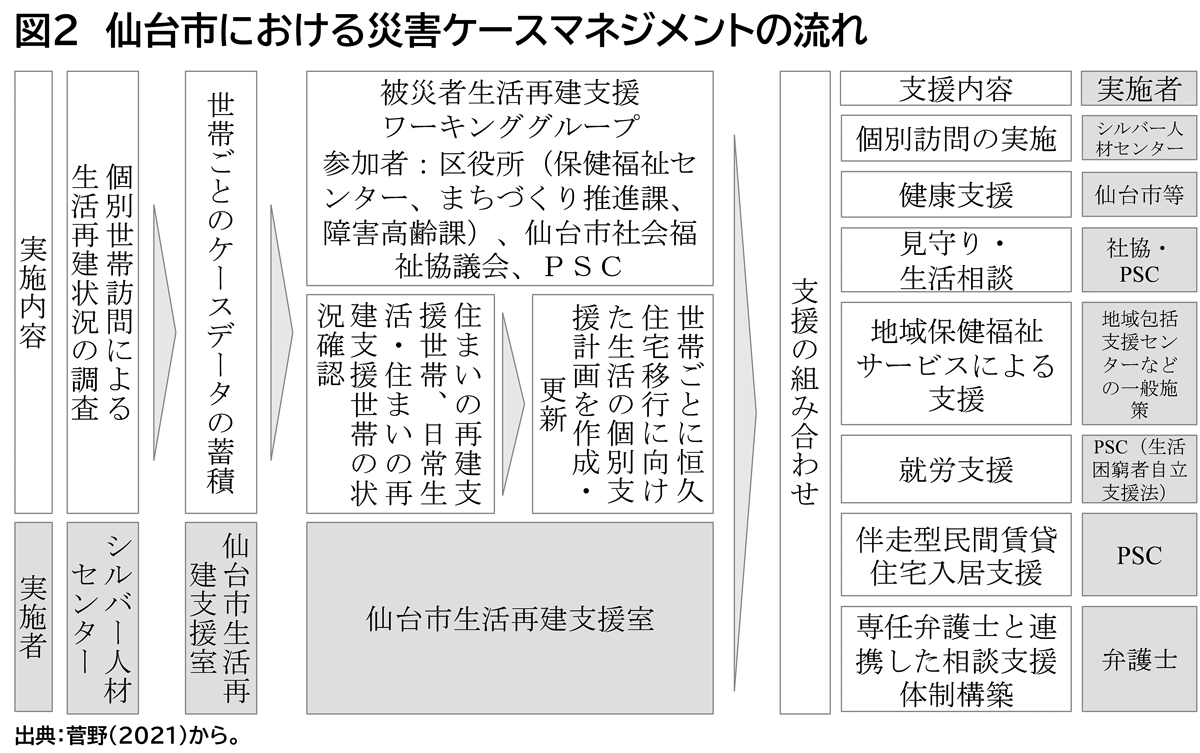 災害ケースマネジメントの発端となった仙台市では、訪問調査によって世帯ごとのカルテを作成しました。その後、仙台市各部局や仙台市社会福祉協議会、NPOのパーソナルサポートセンターなど、支援にかかわる主体が参加する「被災者生活再建支援ワーキンググループ」という会議体を定期的に開催して、世帯ごとに個別の支援計画を策定し、定期的に改定していきました。これによって世帯ごとの支援目標や必要な支援メニューを定め、支援を担う各主体が役割分担したうえで支援にあたりました。支援メニューは戸別訪問や民間賃貸住宅の紹介、弁護士相談など災害に特徴的なものから、生活困窮者への就労支援や介護保険法上の支援など平時の福祉施策まで多様でした(図2)。