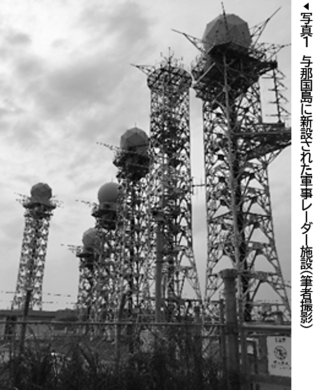 軍事費倍増によってすでに住民生活に深刻な影響が及びつつあるのが、九州から沖縄にかけての南西諸島です。「中国の海洋進出や台湾有事への懸念」を口実として、南西諸島に次々と軍事基地を配備する「南西シフト」が進行しているのです。2016年に新たに自衛隊基地が開設された日本最西端の沖縄県与那国島では、島の風景が大きく変わりつつあります(写真1)。