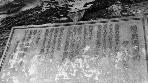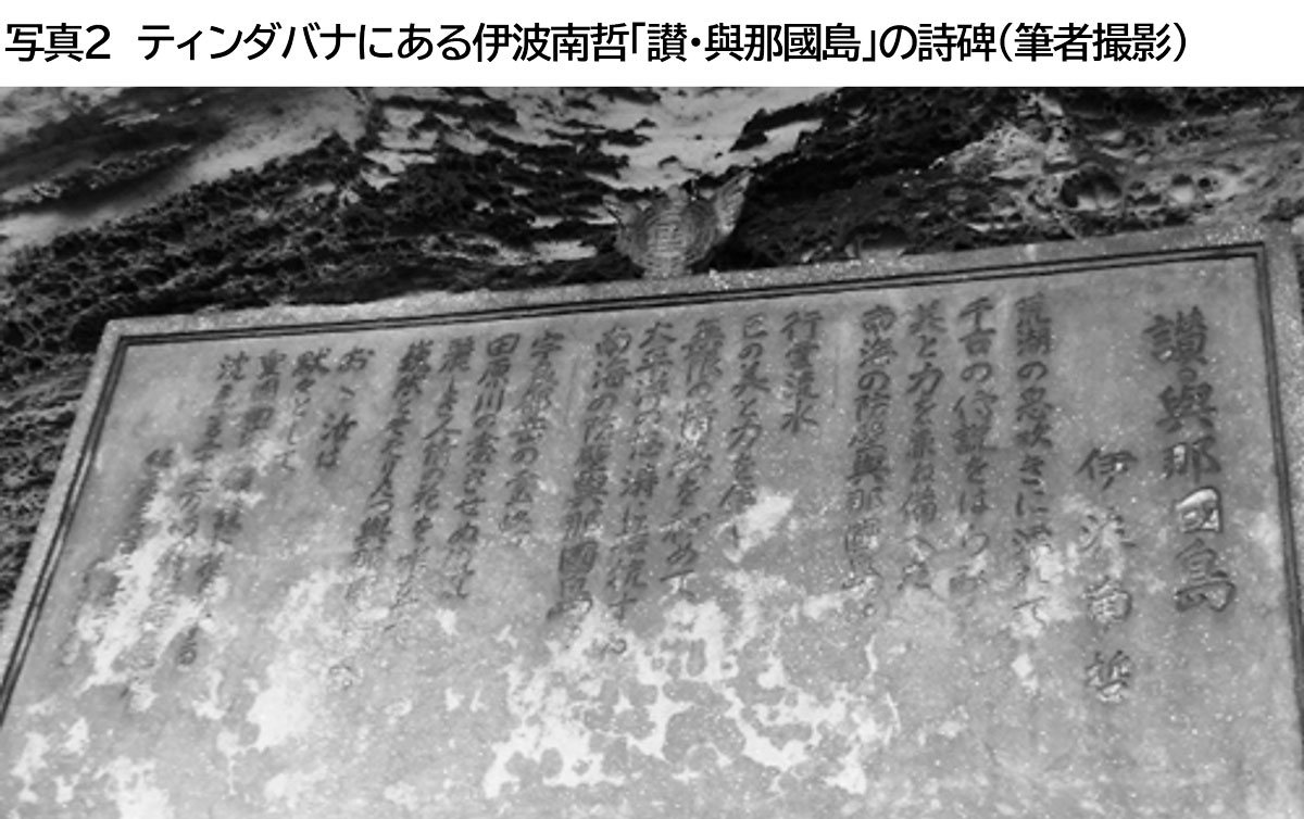 島の中心地・祖納地区を一望できるティンダバナ(国指定の名勝)に古い詩碑が掲げられています(写真2)。私は何気なく撮影したのですが、あとから本田博利先生(元愛媛大学法文学部教授・行政法)にご教示いただき、その内容に驚きました。伊波南哲(作家・詩人)の詩碑「讃・與那國島」には、次のように刻まれています。