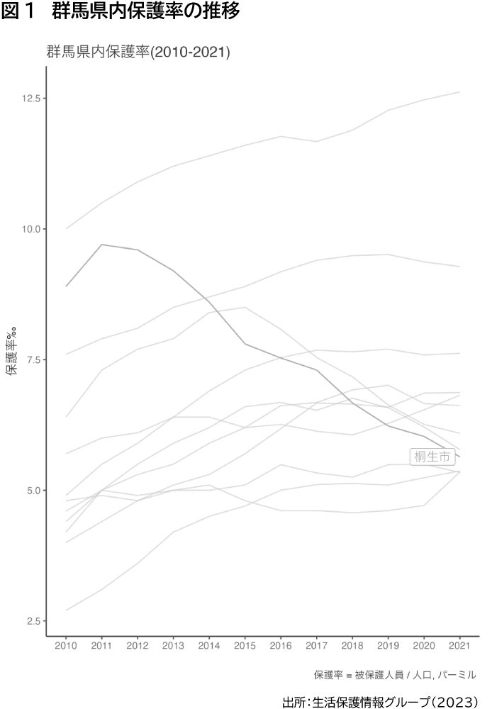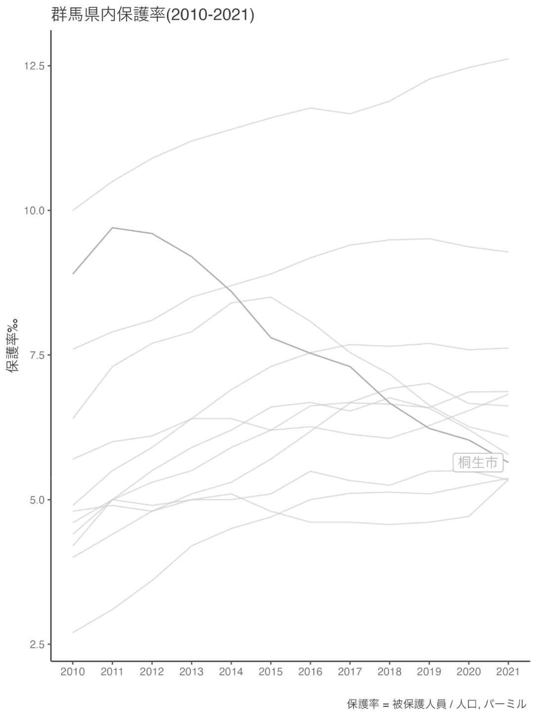 桐生市の構造的問題を考える上で、「生活保護情報グループ」という市民団体が作成した群馬県内の保護率推移のグラフがもっともイメージしやすいでしょう(図1)。2010年代以降、群馬県内のほぼすべての市が保護率を増加させているなかで、桐生市は2012年から保護率が急減少しており、現在ではピーク時(2011年度)のわずか半分の保護率、被保護人員数という異様な急減少をみせています。保護率の増減自体は人口動態や景気動向など複数の要因が絡むものであり、減少=悪というわけではありません(たとえば好景気による雇用環境の改善で保護率が減少することは良いことでしょう)。ただ人口動態や景気動向については近隣地域で近似するのが通常であり、普通は似たような推移をたどります。全体が上昇傾向にある状況下で、特定の1市のみが保護率を急減させているとき、そこには組織的な保護抑制策が取られていることが疑われます。