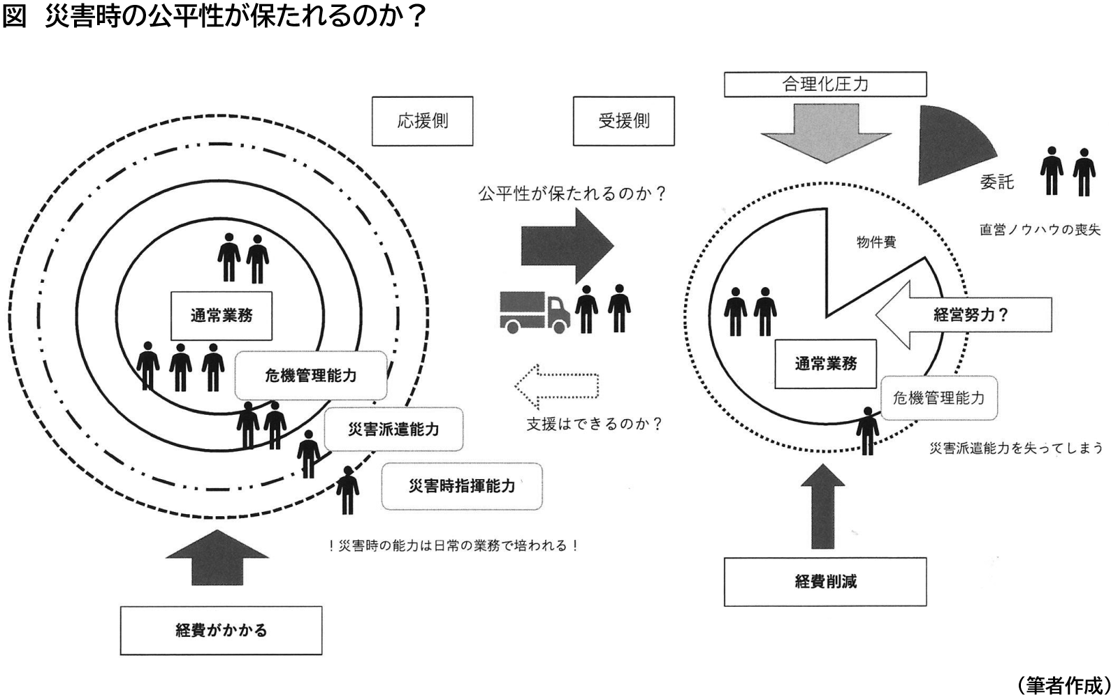 しかし、その懸念は現実となり、業務委託で日常業務による経験を失った職員は、断水復旧のためのバルブ操作など基本的なことも不慣れとなり、災害支援派遣が長期化すると、派遣元の事業体では通常業務を遂行する人員が不足し、「派遣職員も、残される職員も大変」な状況に陥っています。