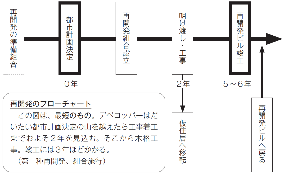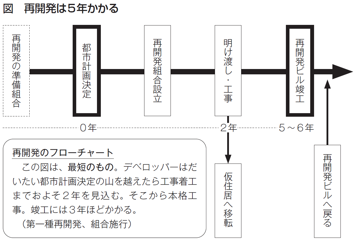 いざ事業が始まったとしても、高齢者にとってみれば、今度は、2度も移転を迫られる再開発にはたいへんな負担が伴います。都市計画決定から再開発の一連の手続きを経て工事着工まで2年、それから竣工まで3年と、最短でも5年はかかります(図)。