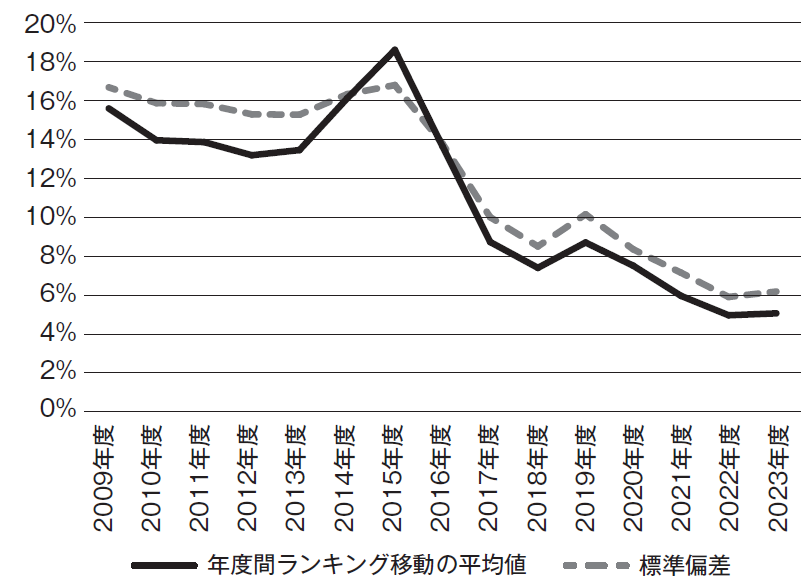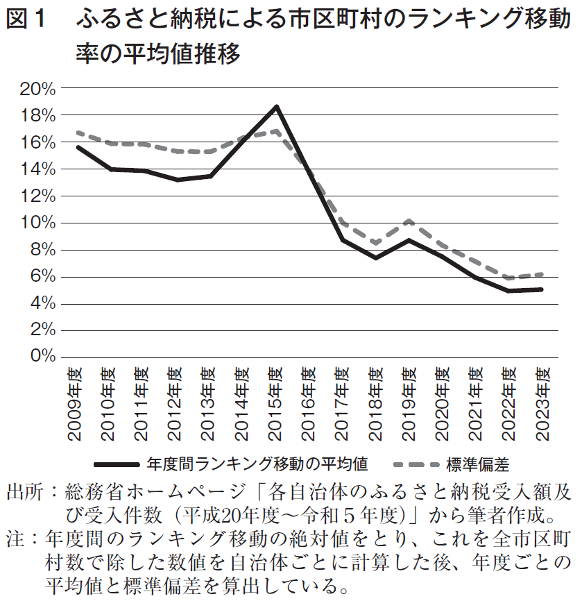 ふるさと納税の寄付額競争において、ランキングがどのように変動しているのかを、統計的に確認してみましょう。自治体ごとに年度間のランキングの移動を数値化し、移動の割合を計算します。例えば、ある自治体が年度間で100位ランキングを変えたとすれば、移動の割合は5・7%となります(100の移動を全市区町村数1741で割った数値)。この移動割合を年度ごとに平均化し標準偏差とともに表したのが図1です。