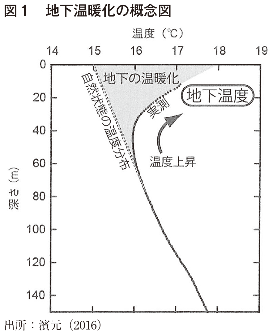 実は、地下においても温暖化が問題となっています。地下では、自然状態であれば直線状の温度分布が測定されるのに対して、地下温暖化が進行すると地下数十メートルから地表面にかけて温度が上昇し、湾曲した温度分布が観測されます(図1)。