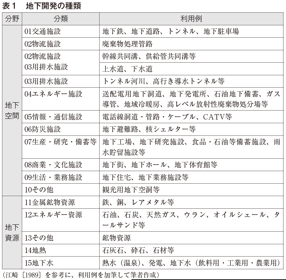 人類は永年にわたり地下空間を利用してきましたが、地表空間にさまざまなインフラが密集するようになると、新たな空間創出のターゲットとなり、多種多様な開発が進められています。表1を見ると、それぞれの分野で、地表に近いところだけではなく、大深度地下(地表からおおむね40メートル以深)に開発が及びつつあります。