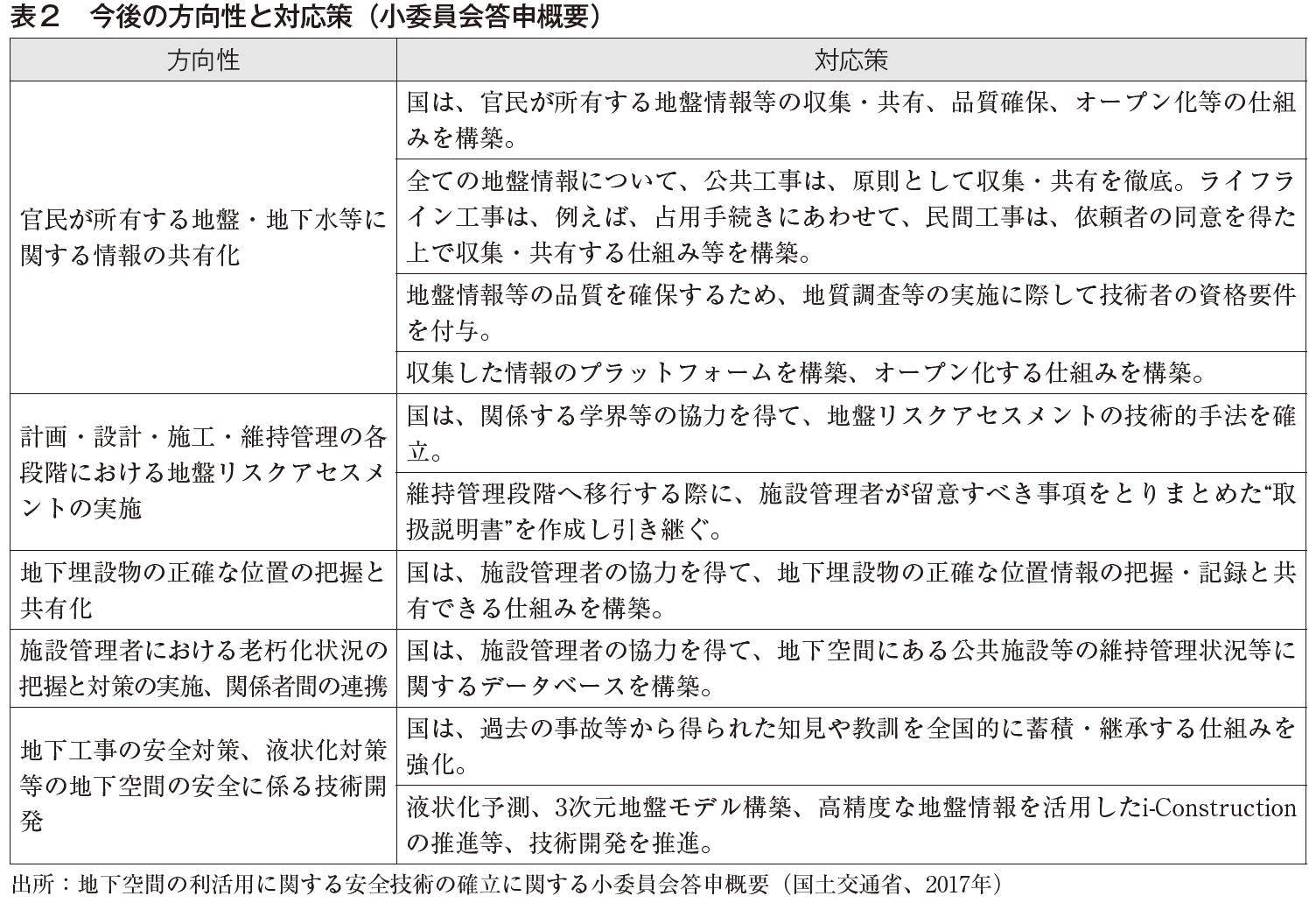 答申では今後の方向性として五つの柱を据えています(表2)。いずれも重要かつ緊急性の高い内容ですが、いままでこうしたことができていないまま、大深度地下開発などを推し進めていた証左でもあります。