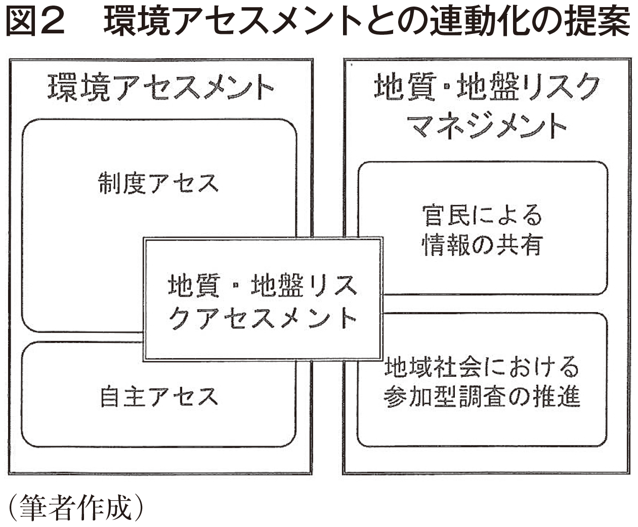 住民からすると、これらは一体的に捉えて、影響を予測評価し、対策を示すべきものです。現行の環境アセスメント手続き(自主アセスを含む)において、地質・地盤リスクアセスメントを組み込んで、地域社会とのコミュニケーションを図るべきです(図2)。