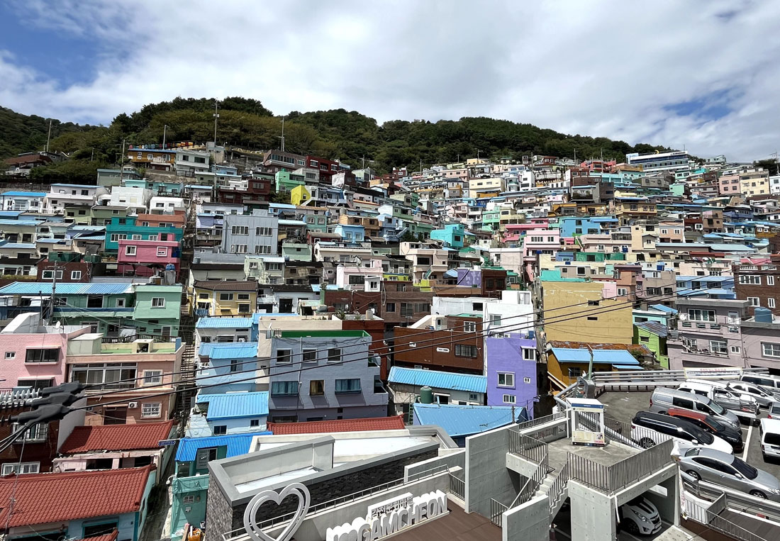 甘川文化村は、甘川2洞の行政区画に属し、釜山市沙下区の丘陵地帯に位置しています。1950年代の朝鮮戦争時には避難民が集住し、長らく低所得層が暮らす地域でした。急傾斜に沿って階段状に建てられた家々や、背後の家が隠れないよう工夫された建築配置などが、独特な景観を形作っています。