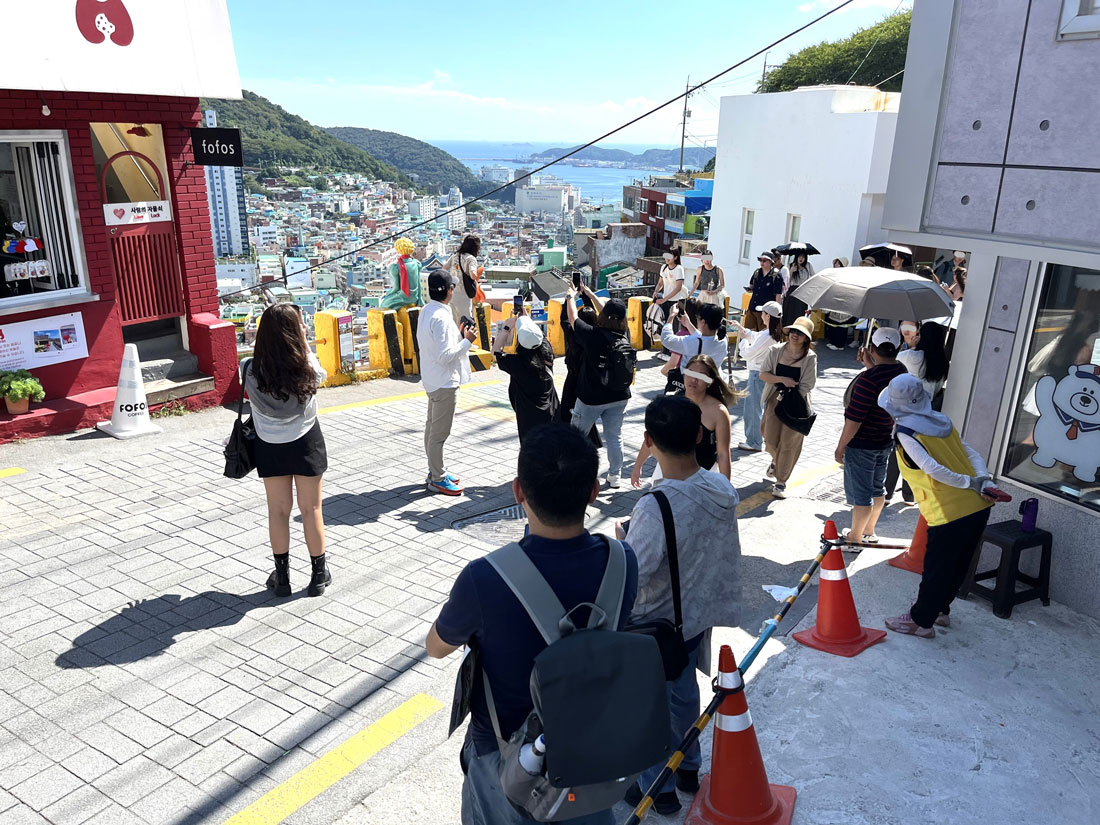 2009年には、韓国文化体育観光部の都市再生事業として「夢をみる釜山のマチュピチュ」プロジェクトが始まり、地域は「甘川文化村」と呼ばれるようになりました。その過程では、芸術家の指導のもと住民も参加し、壁画やオブジェの設置、空き家のギャラリーへの改修といった取り組みが進められました。2012年には「アジア都市景観賞」を受賞。独特な景観とカラフルな建物はSNSで注目され、若者や外国人観光客をひきつける観光資源となりました(写真1)。さらに、南浦洞の繁華街にも近く、現在でも釜山を訪れる人々にとって立ち寄りやすい観光地となっています。