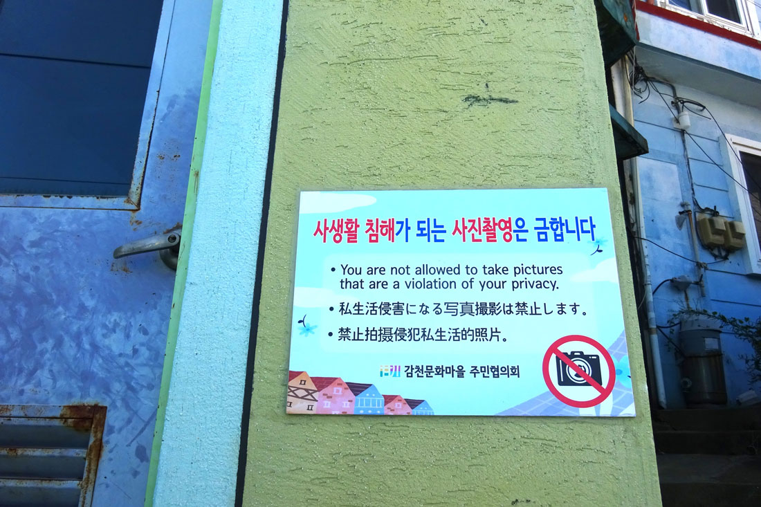 観光客の主な行動はアート作品との写真撮影です。狭い階段でポーズを取る台湾人グループや、ガイドマップを手に歩く英語圏のカップルの姿が目立ちました。この中には、居住空間に入り込む者もおり、協議会は私生活の侵害を防ぐため、「写真撮影禁止」(写真3)や「屋根に上らないでください」などの案内板を設置して対応しています。
